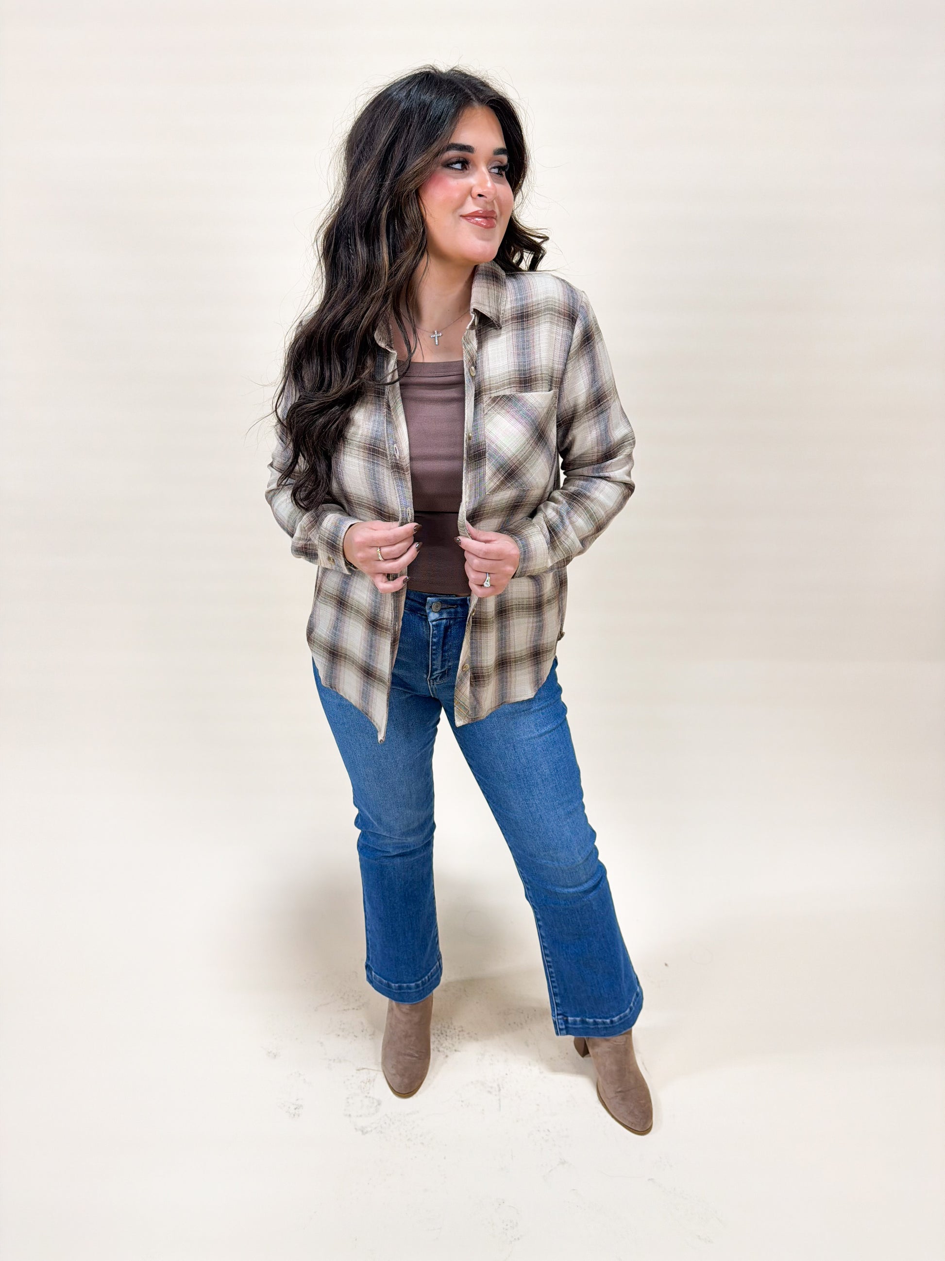 - Wrap yourself in cozy comfort with this charming brown flannel top!
