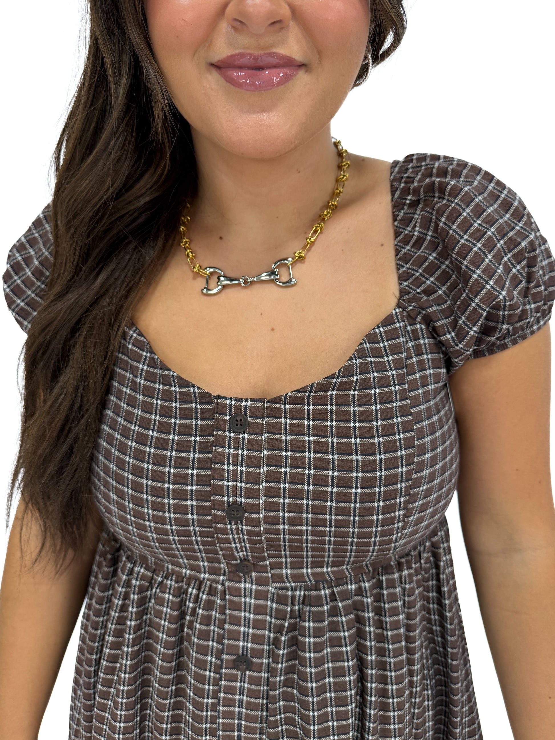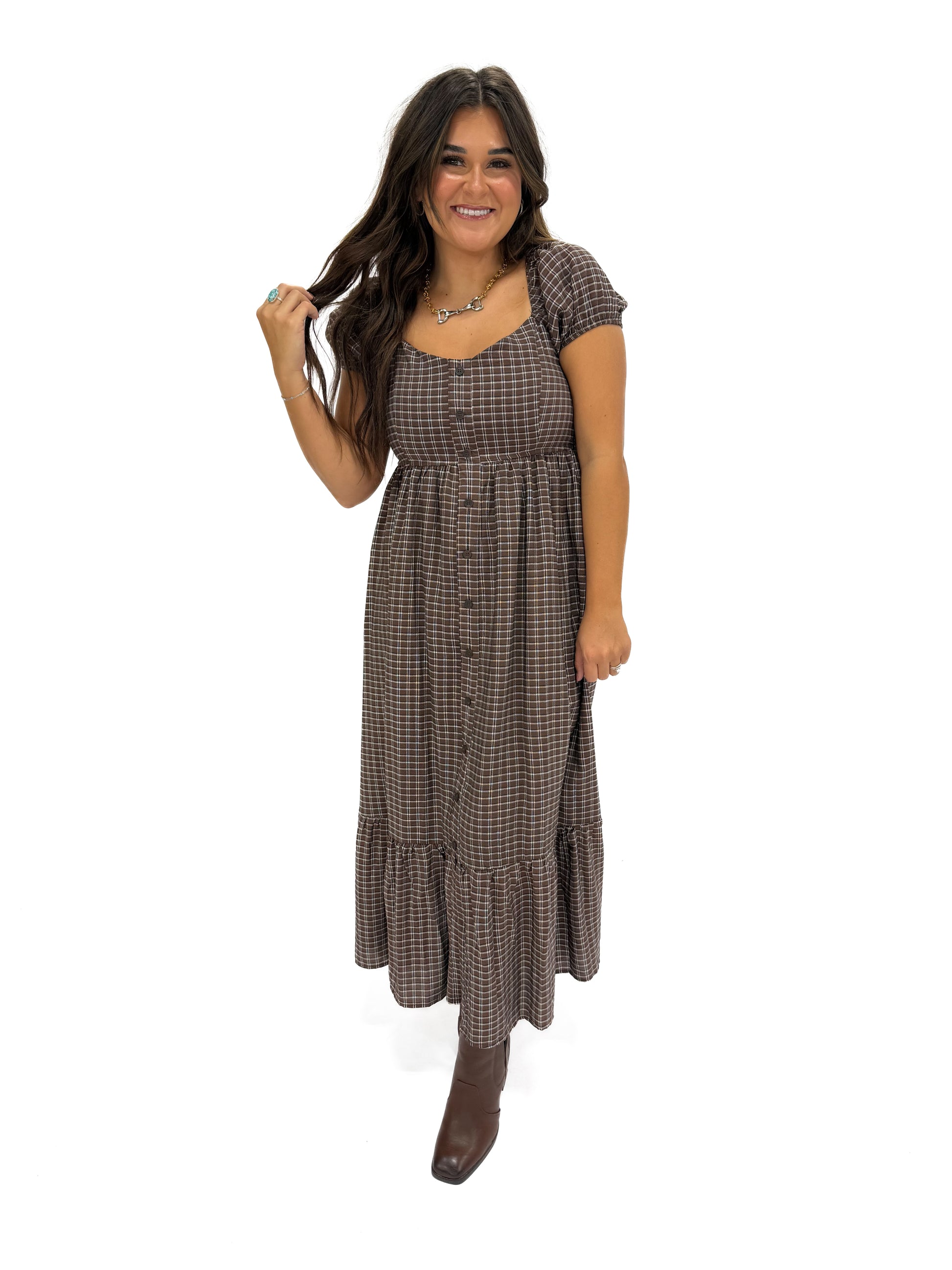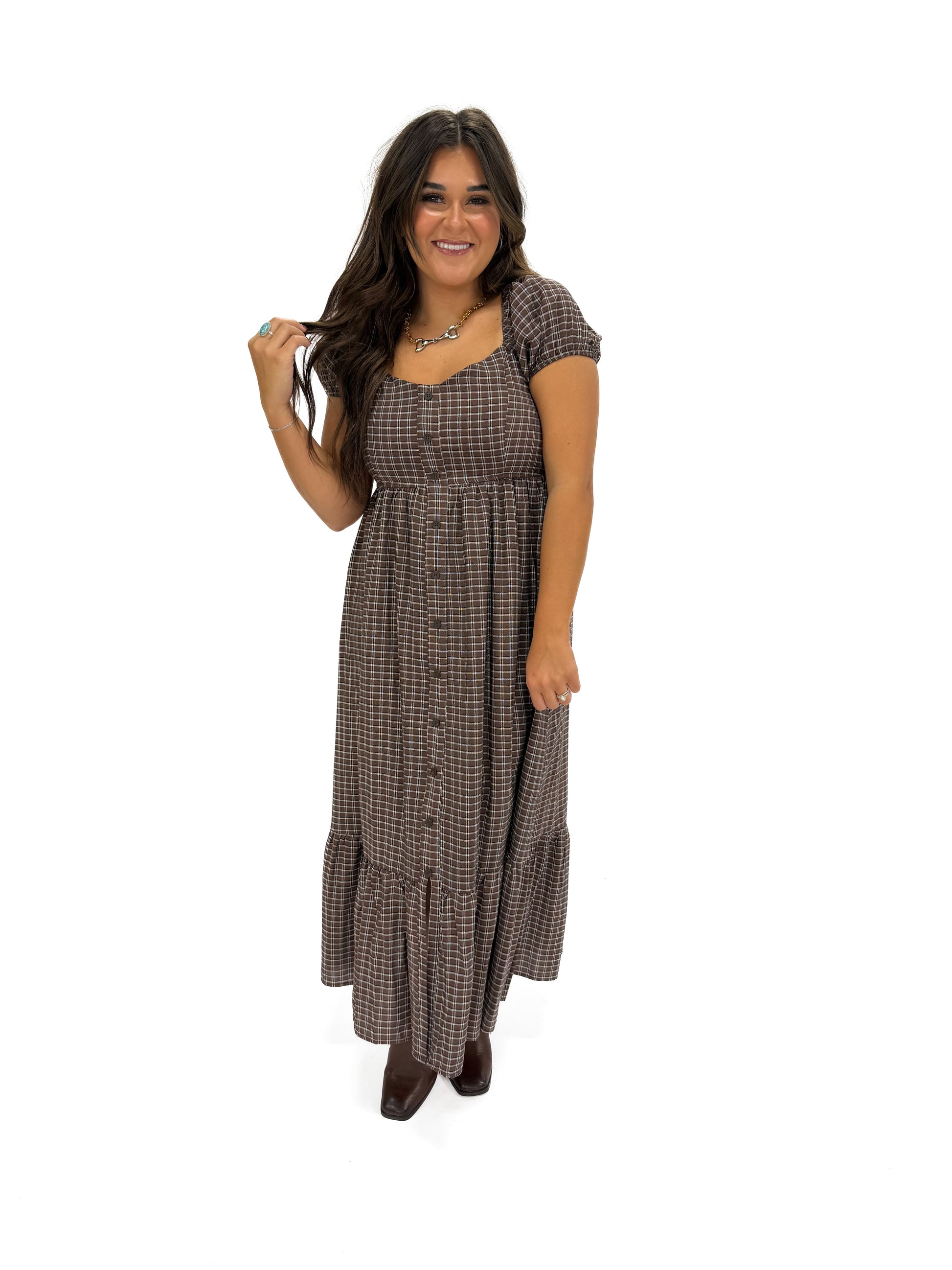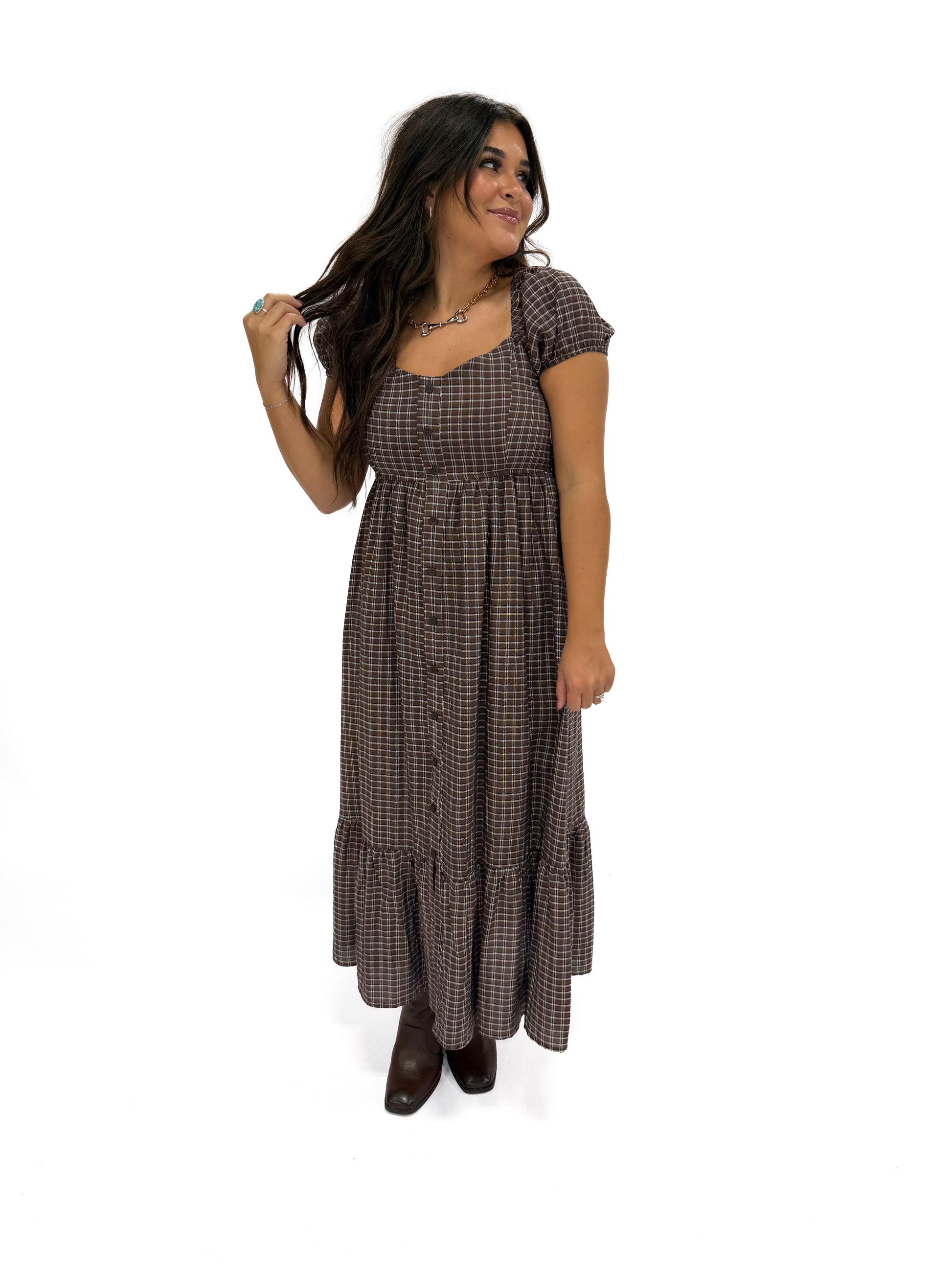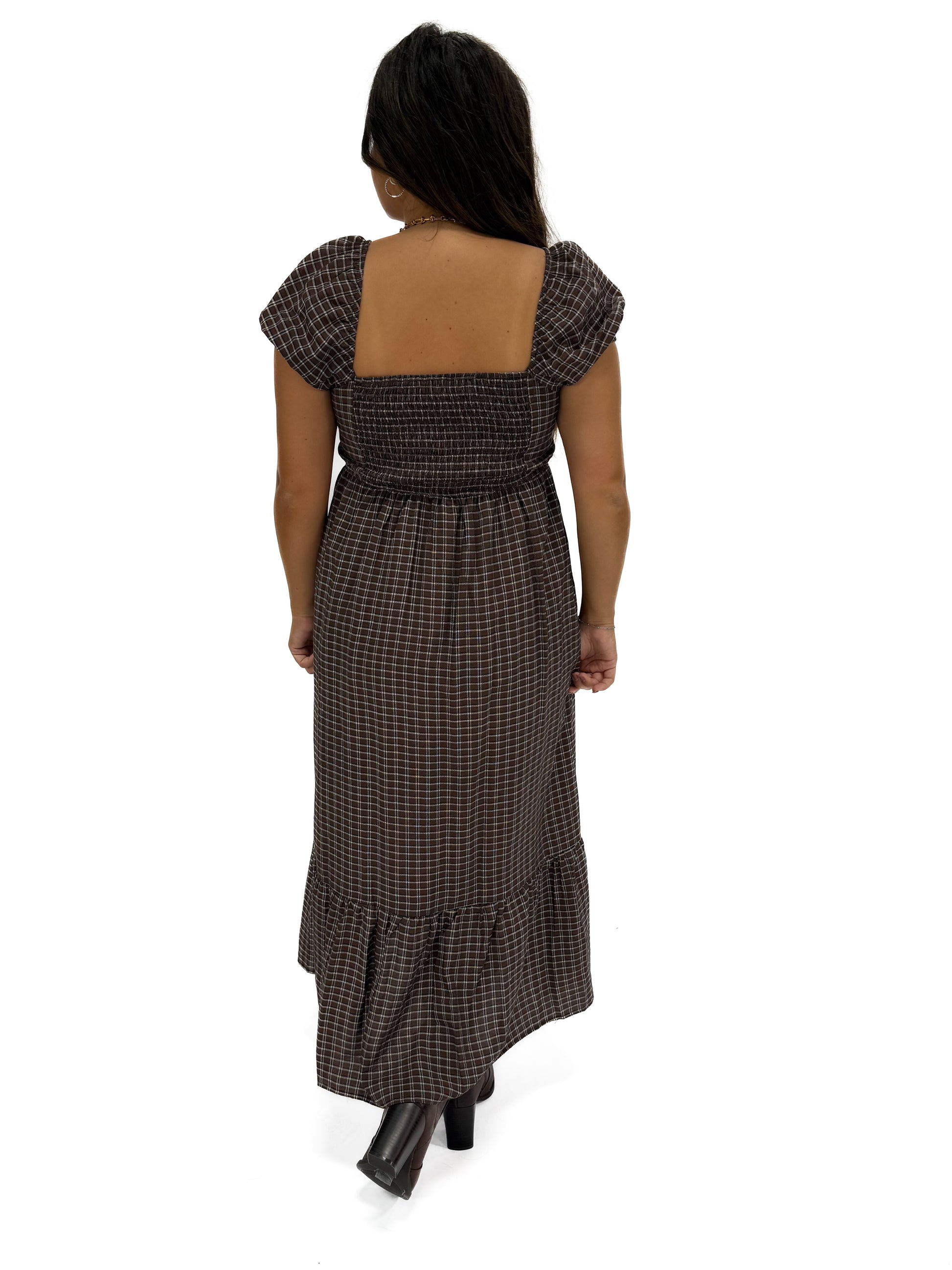 - Step out in style with the plaid brown puff sleeve dress.
