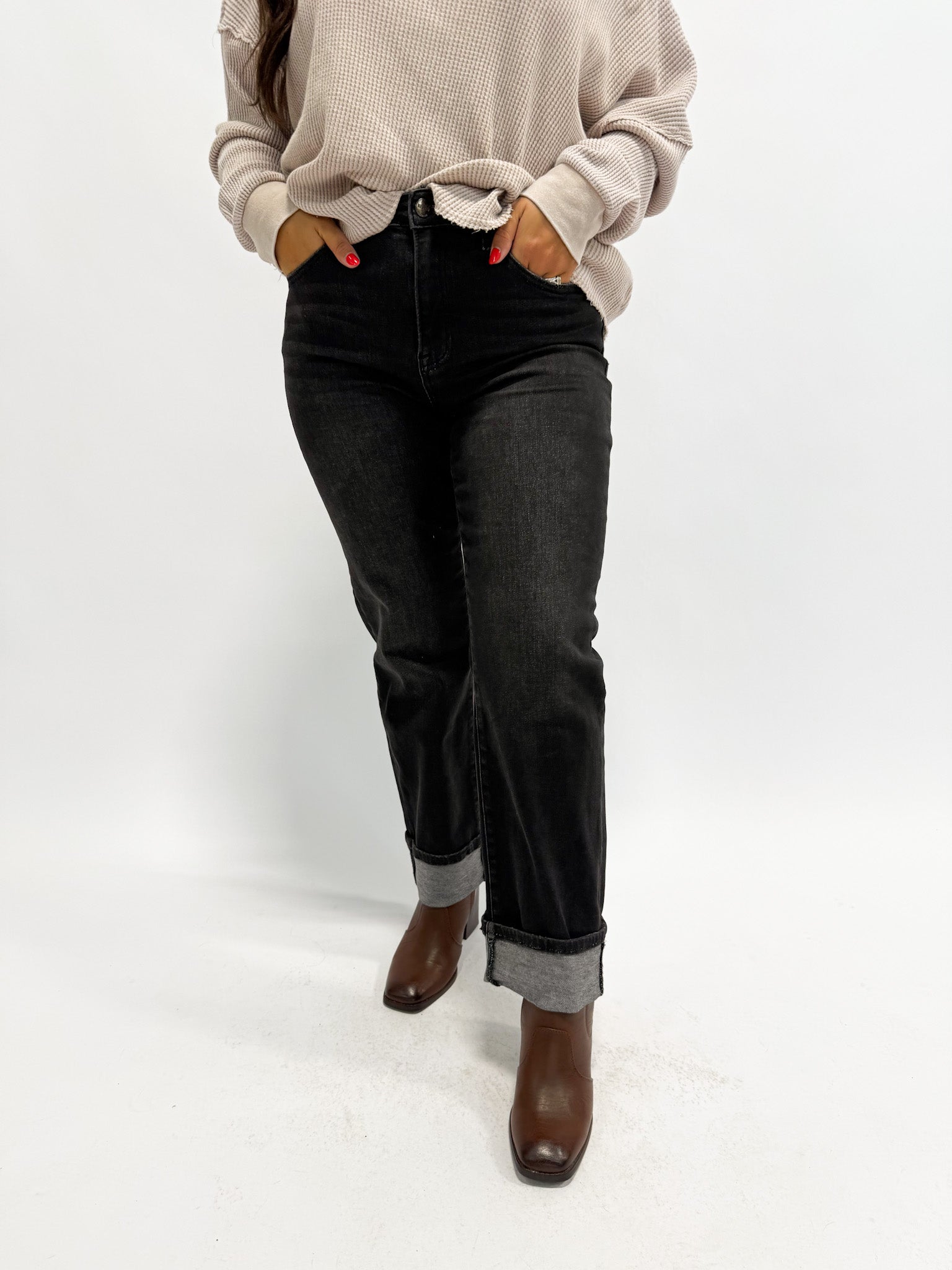 - These straight-leg jeans feature a trendy turn-up cuff and a flattering high-rise fit that hugs your waist just right!