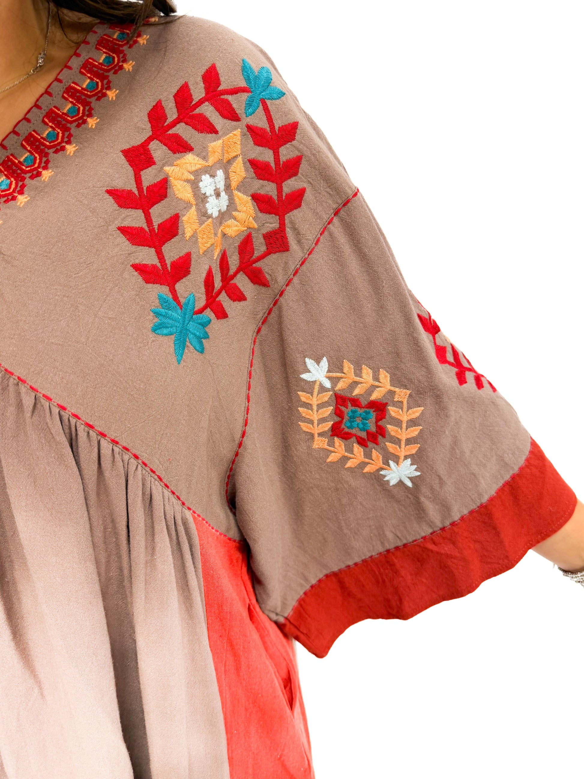 - Crafted from soft poly linen, it features playful embroidery and stylish ruching that add delightful details.