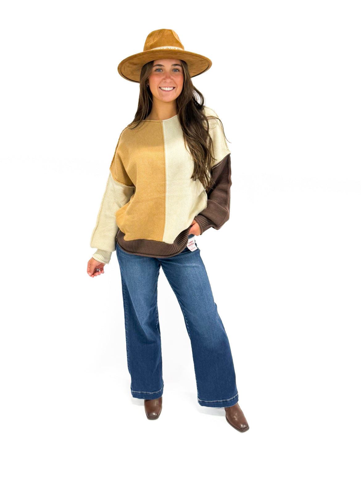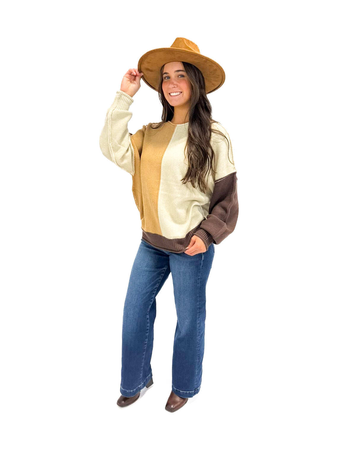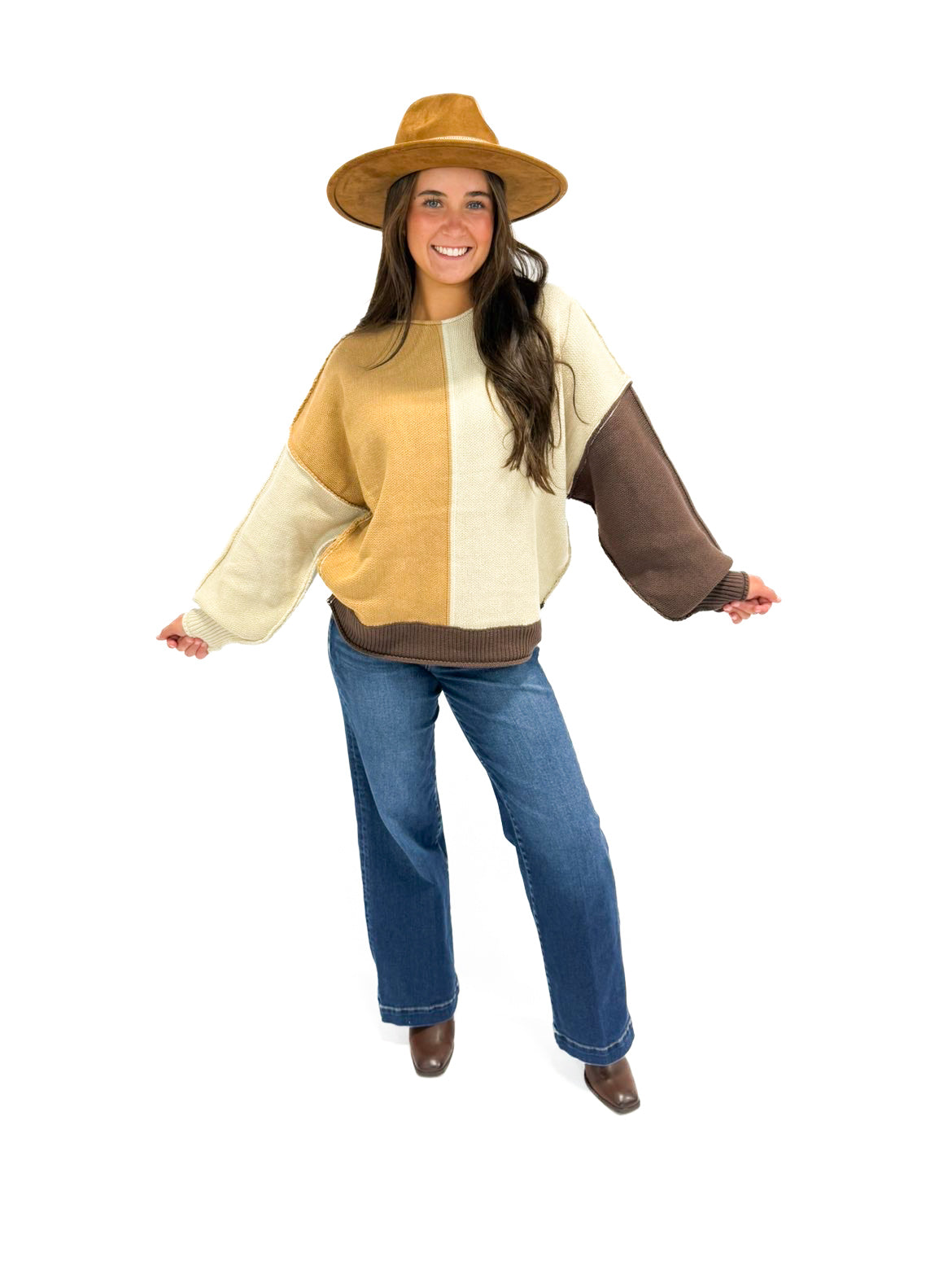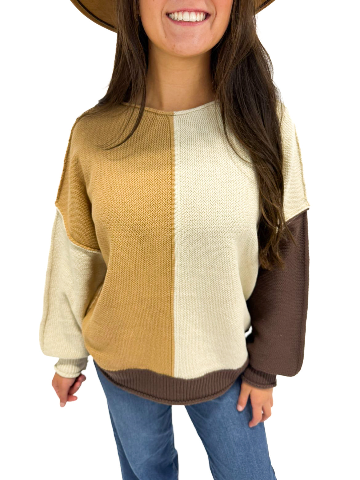 - Featuring bold, contrasting panels that mix warm autumn hues, it's the perfect layering piece for cozy gatherings and casual days.