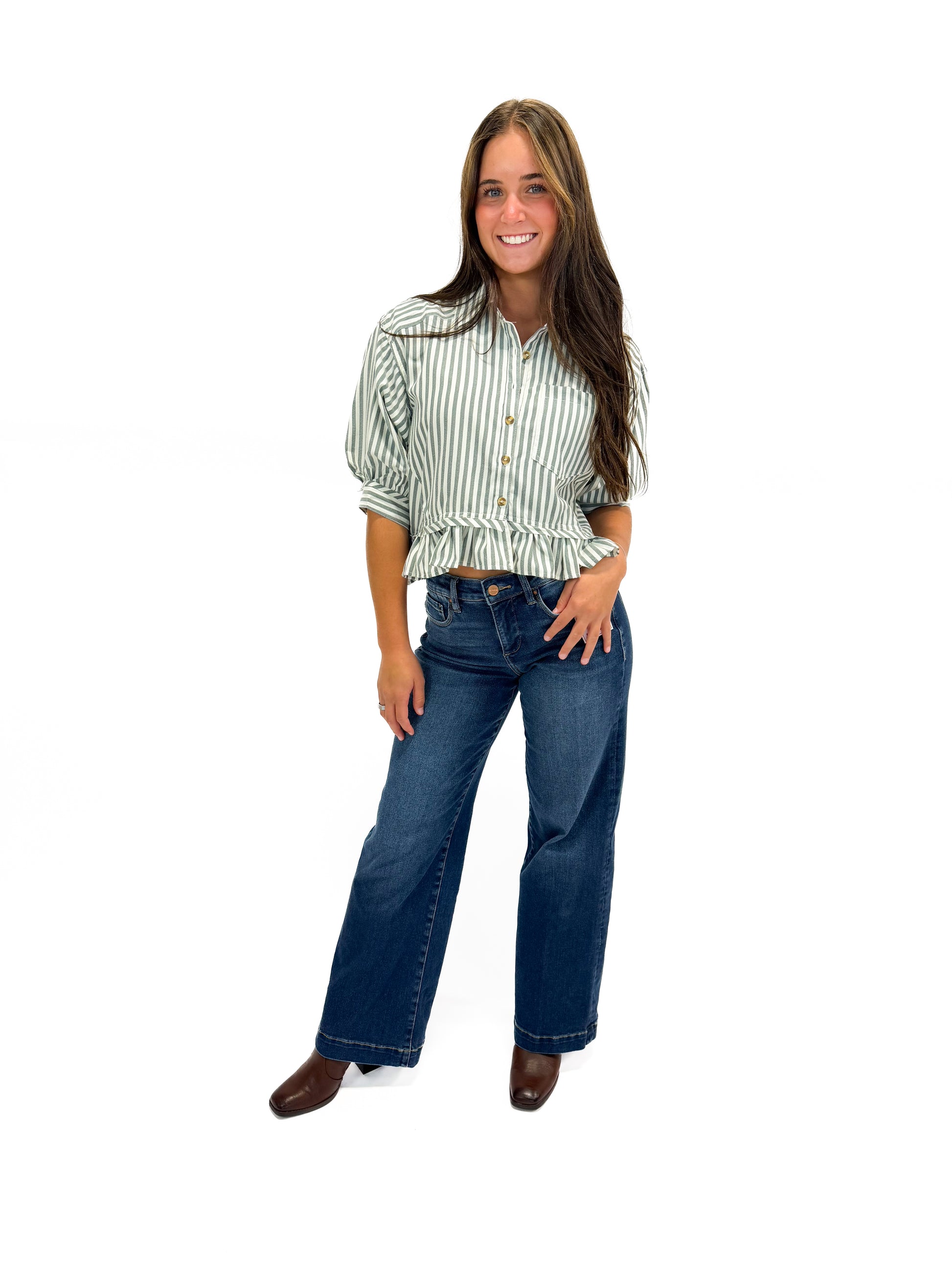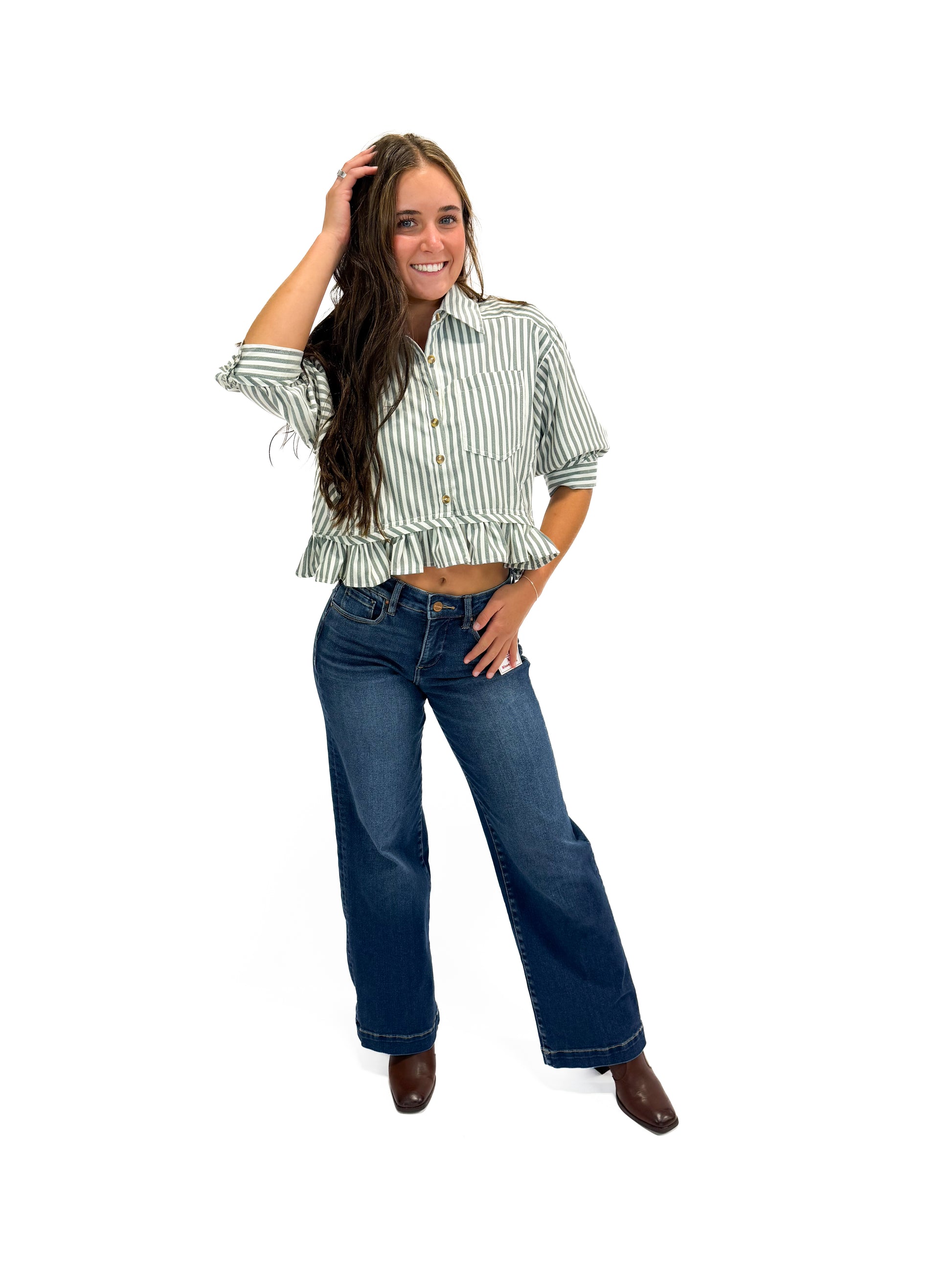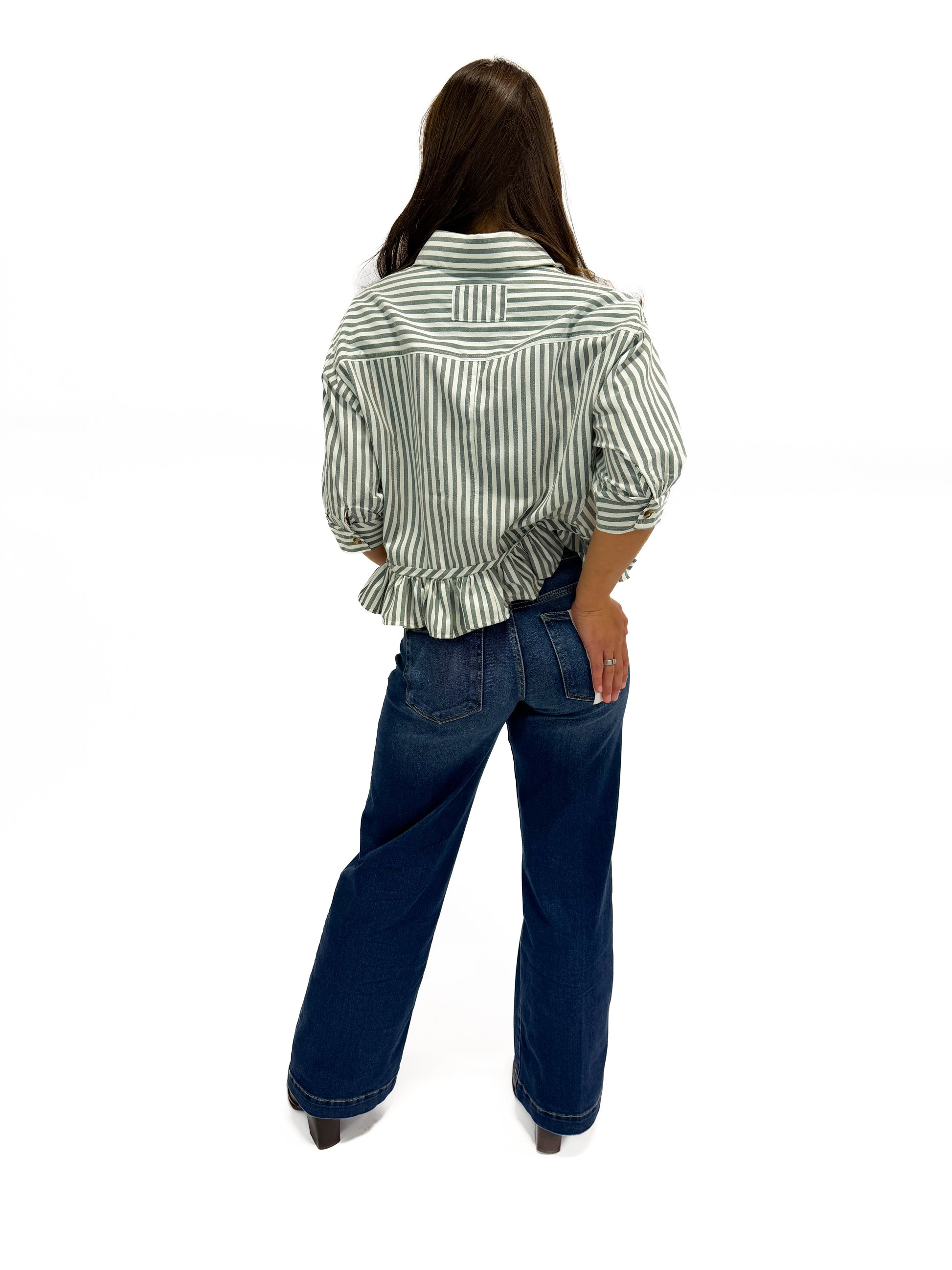 - The single chest pocket and ruffled hem add a fun touch to this striped top. Make a wish and add it to your cart today!