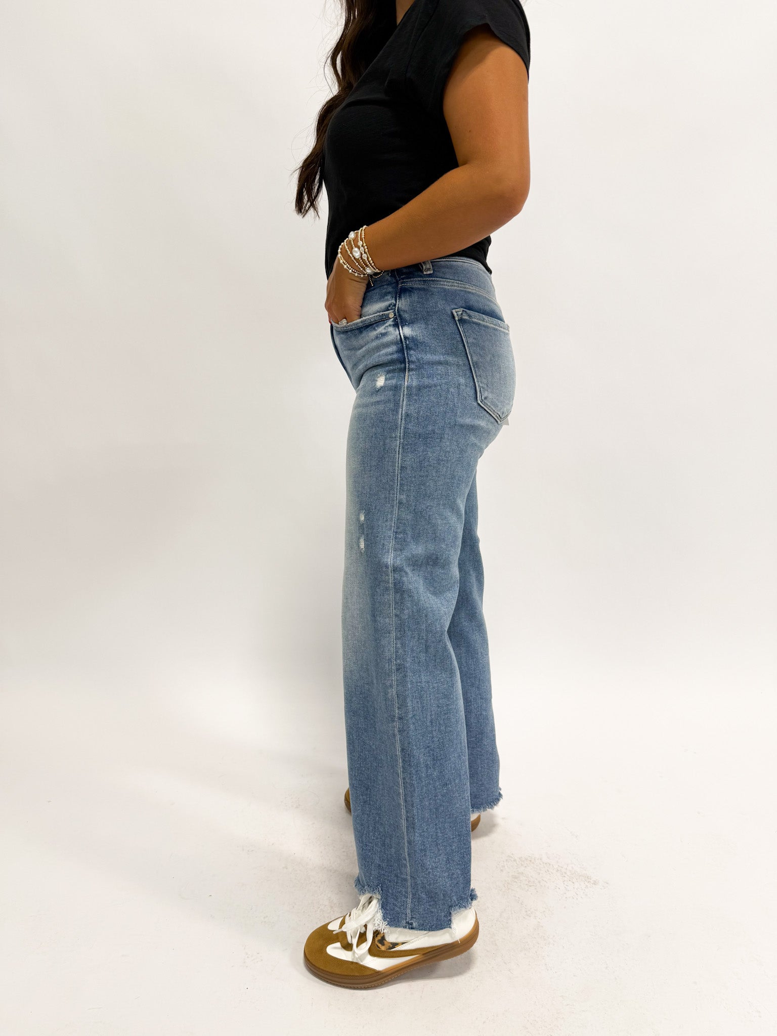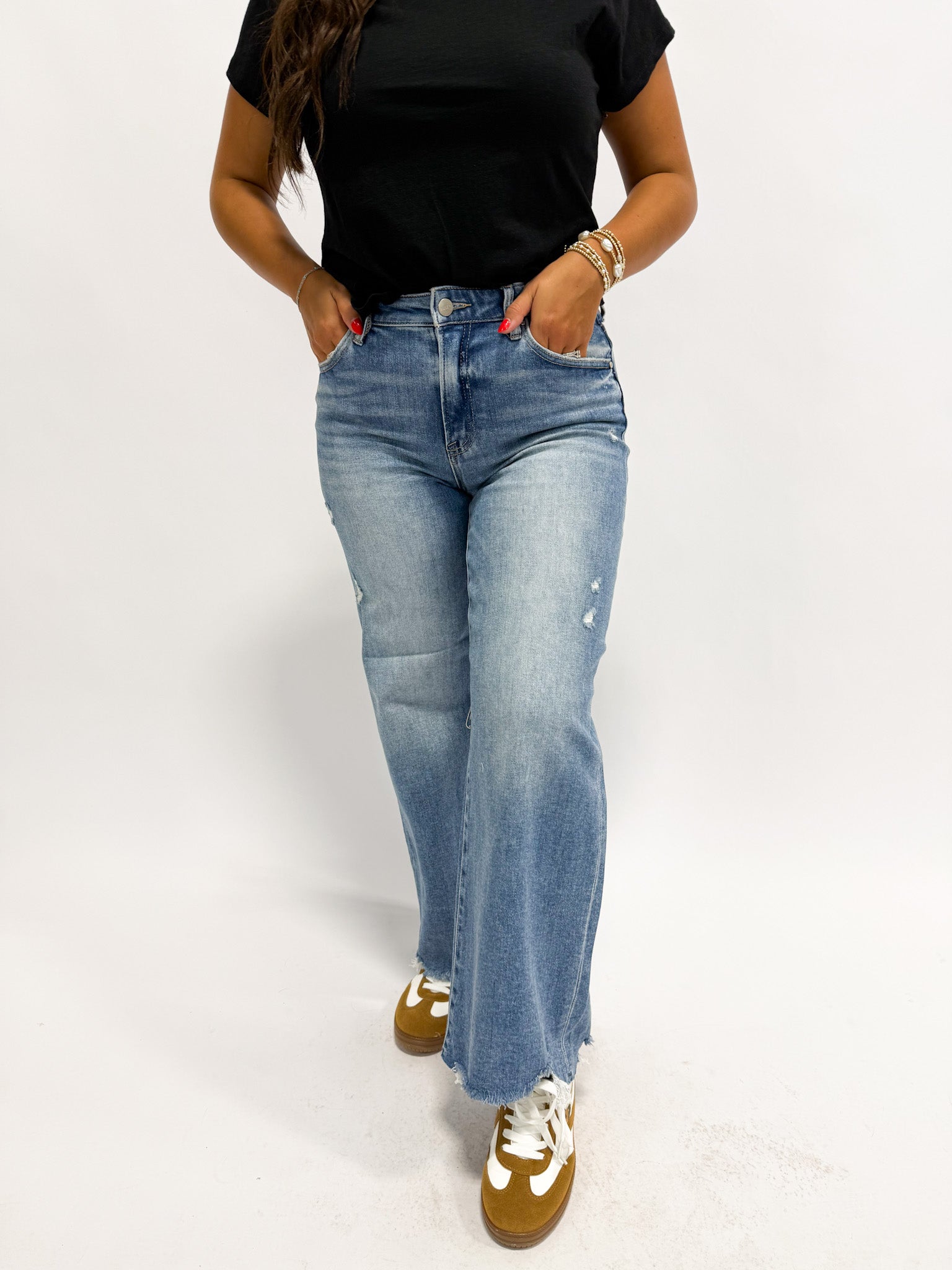 The Fall Leaves High Rise Wide Leg Jean in a medium wash is your new go-to for fall!
