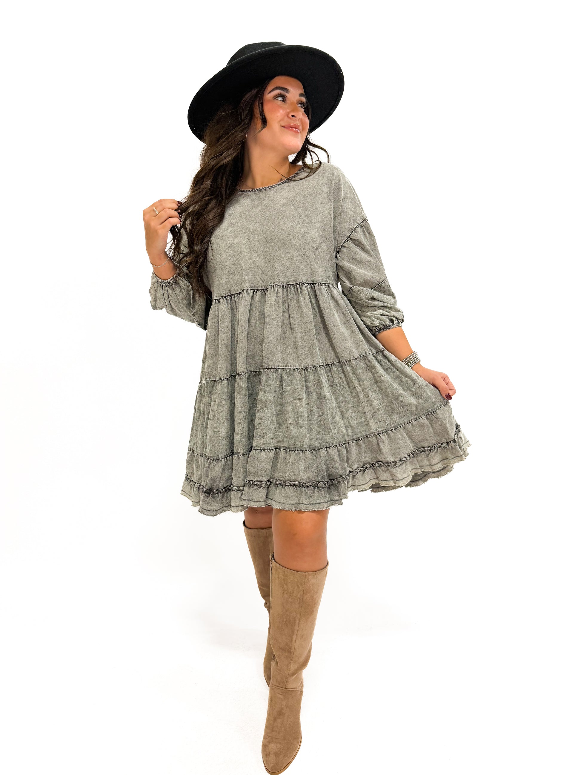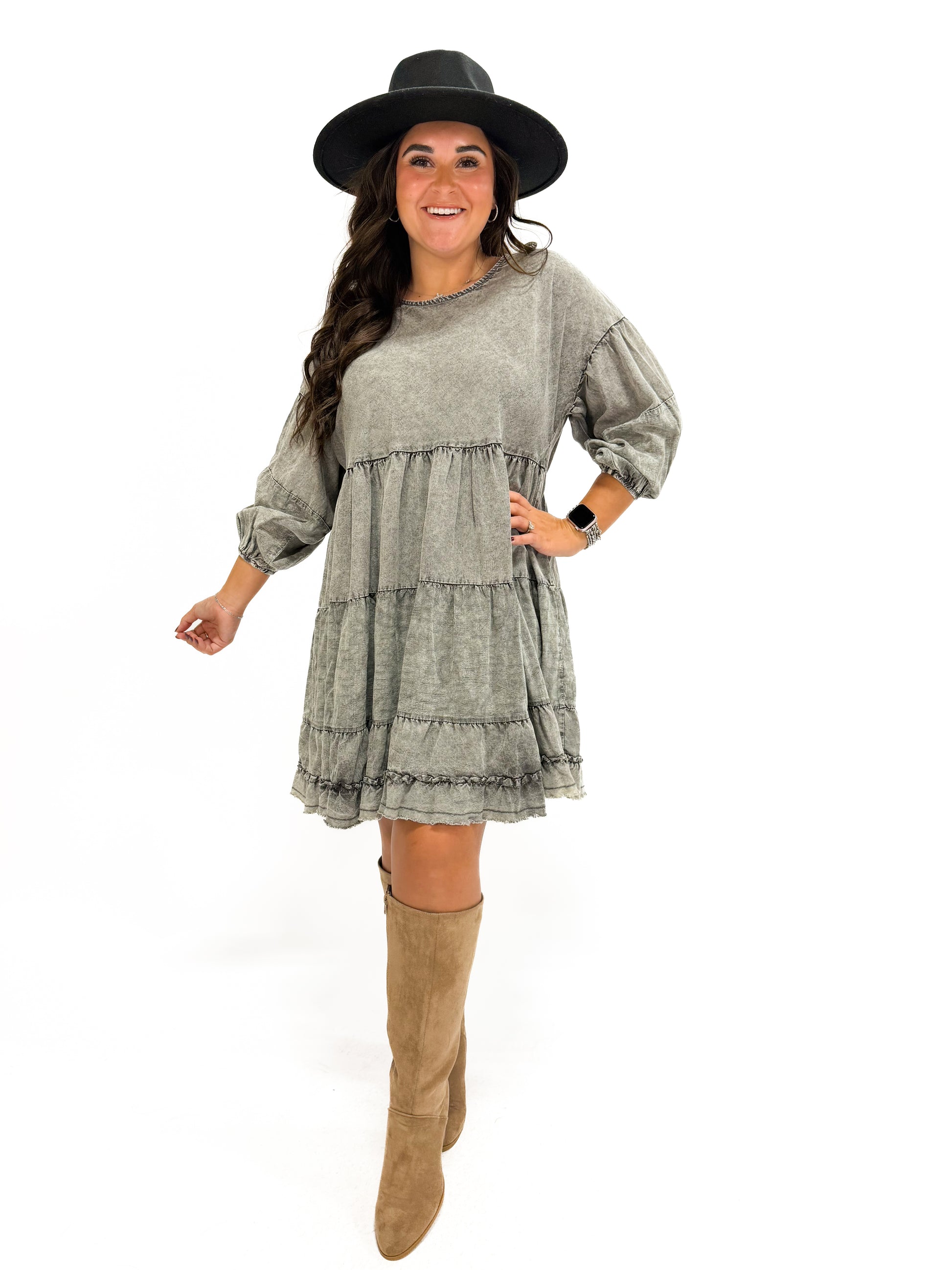 - Its acid-washed grey fabric adds a cool, vintage edge, while the puff sleeves bring a fun, flirty twist.