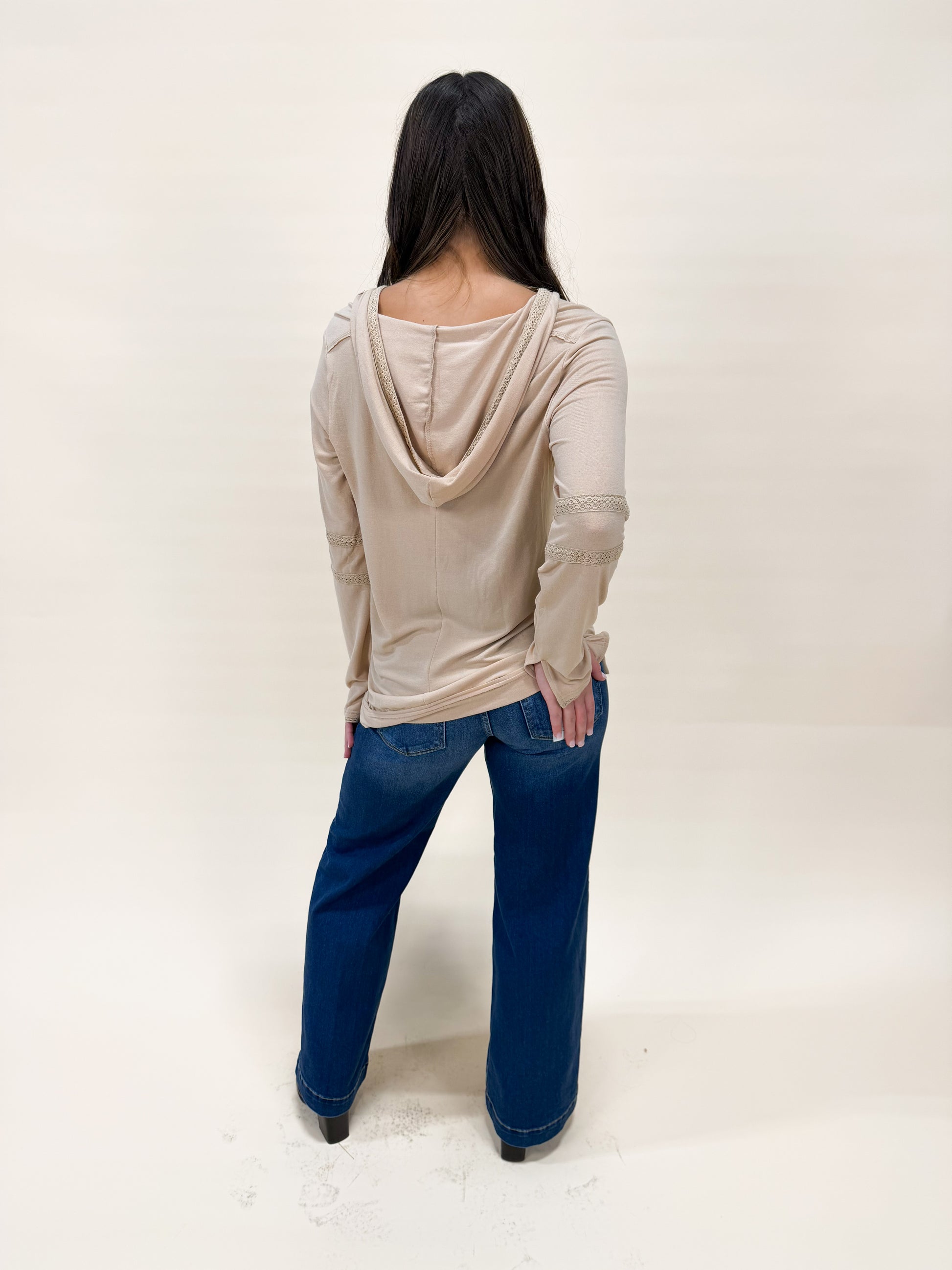 - Elevate your everyday style with this charming lace detail top featuring a cozy hood.