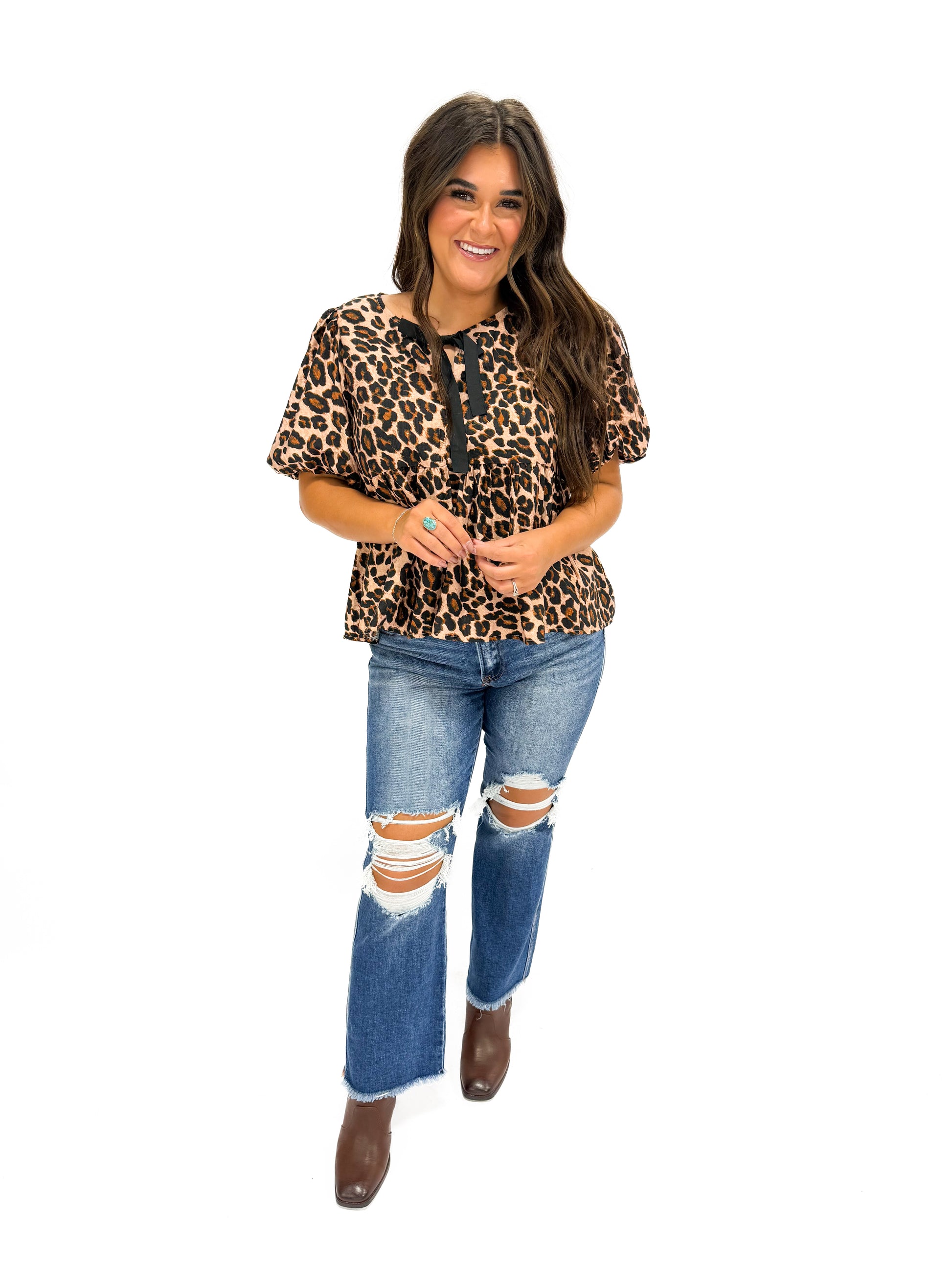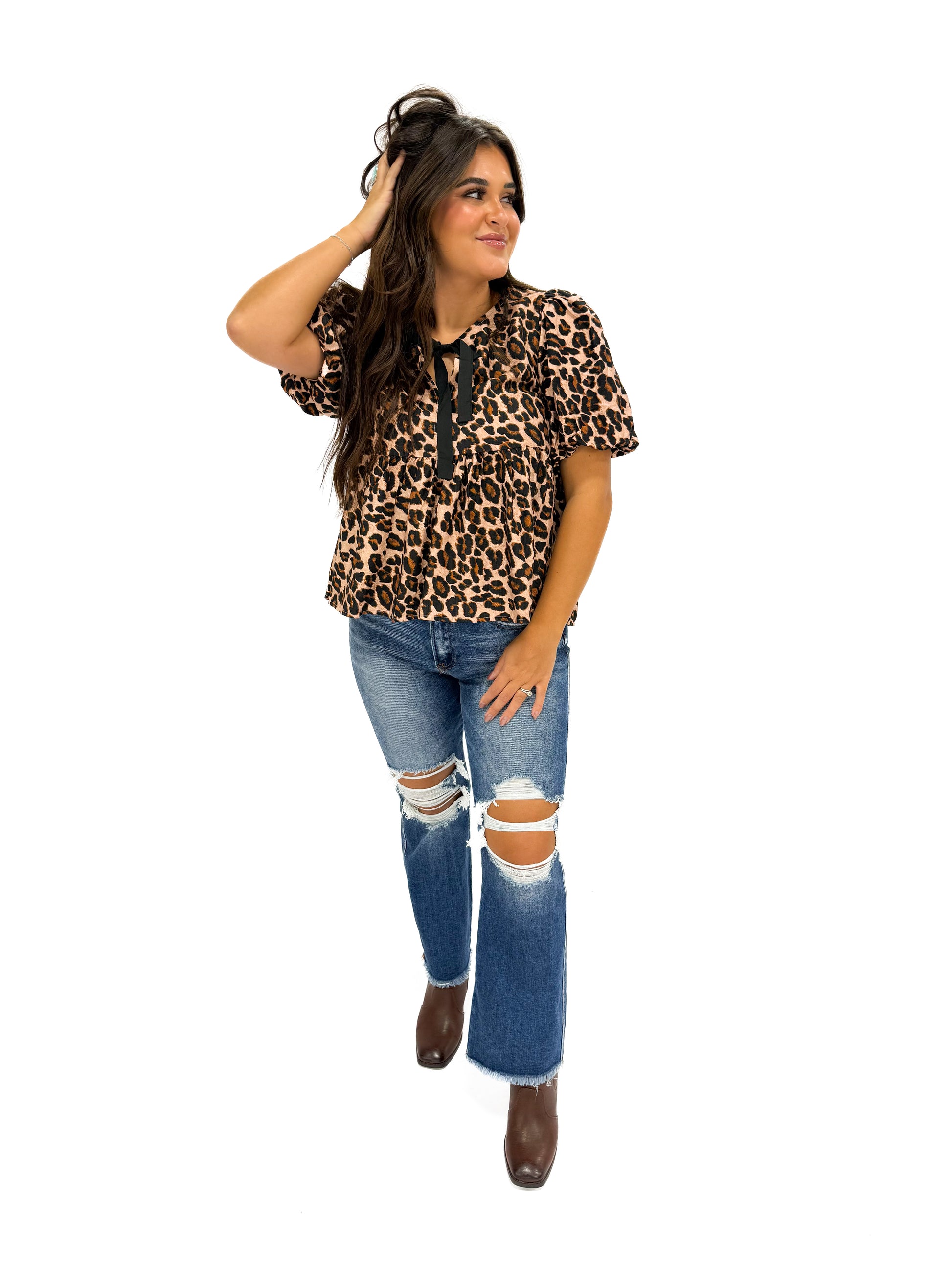 - The cheetah print brings playful energy, while the structured sleeves add volume and flair!