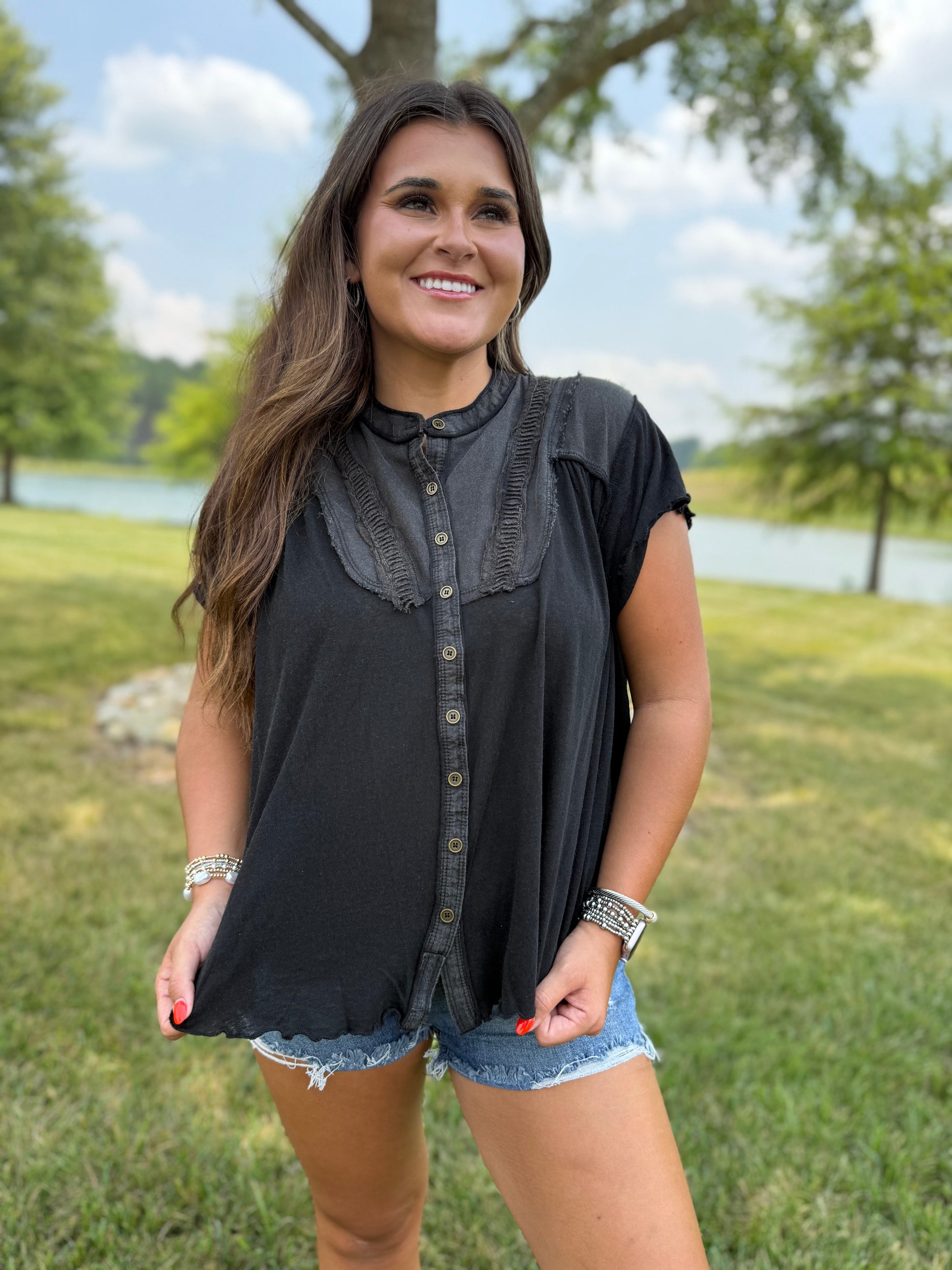 - This breezy, vintage washed top features delicate pleated and ladder lace trim on the yoke, flutter sleeves with raw edges, a relaxed button front silhouette, and a gathered back panel for an effortless, free flowing fit with a touch of bohemian charm.