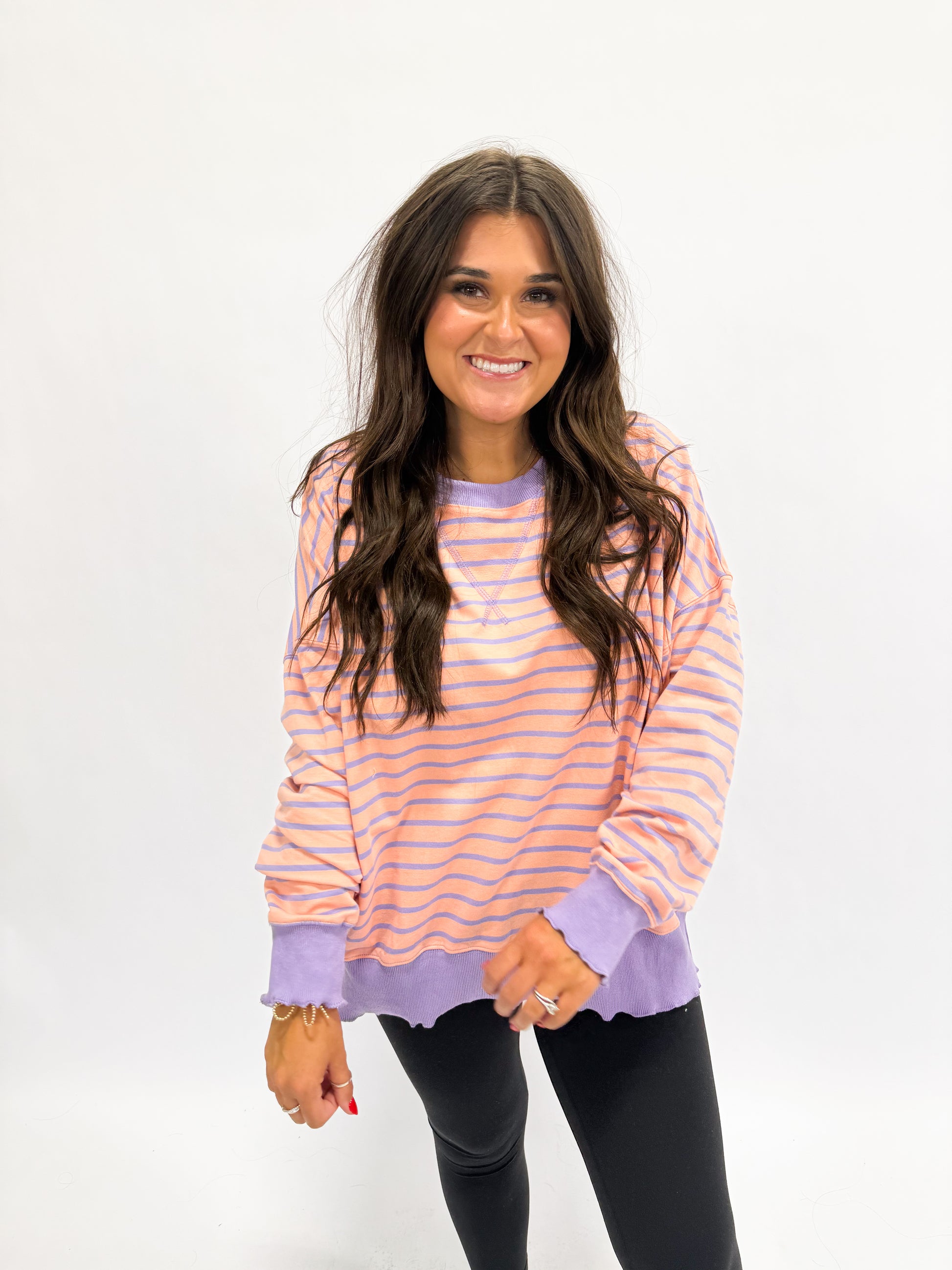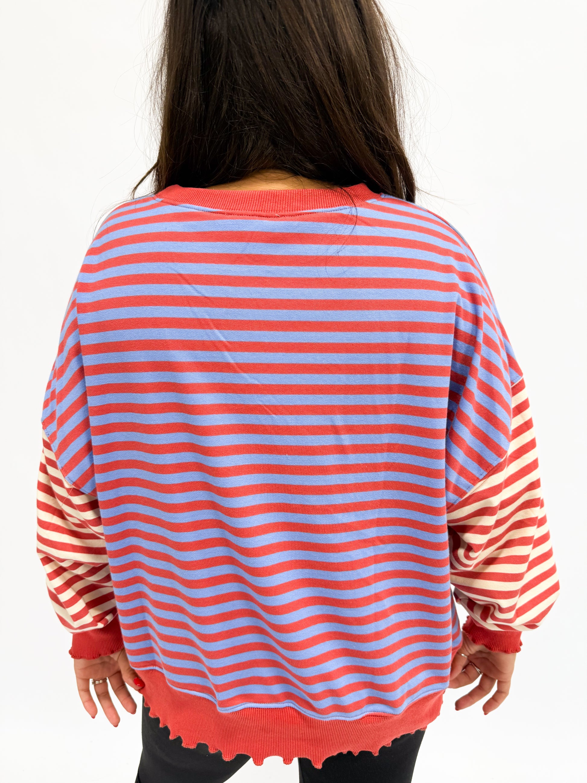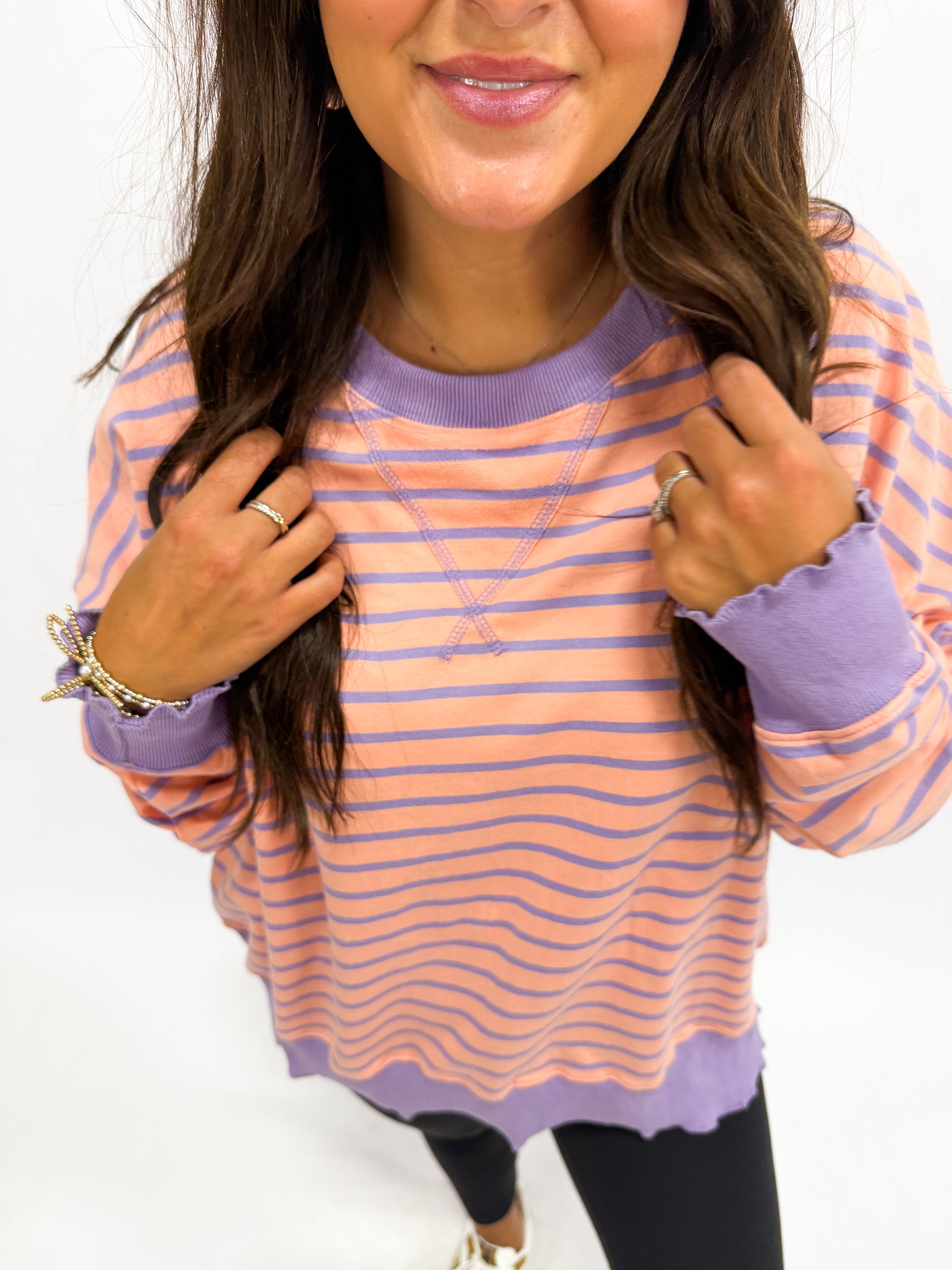 - This playful sweatshirt features bold color block stripes, a cozy crew neck, and a fun lettuce hem detail that adds a flirty twist!