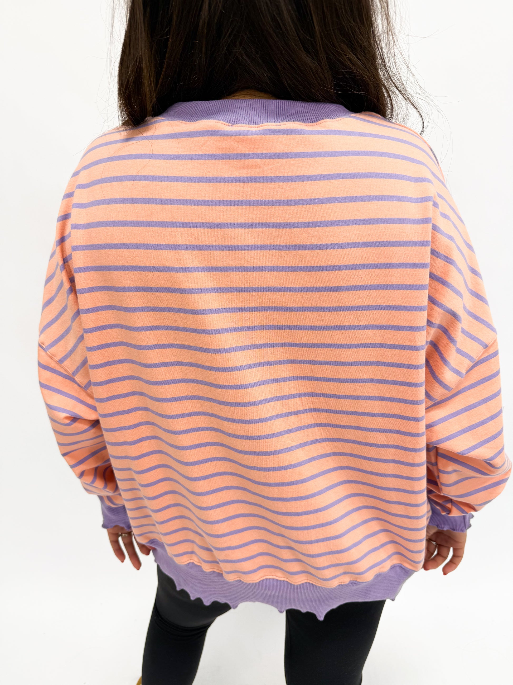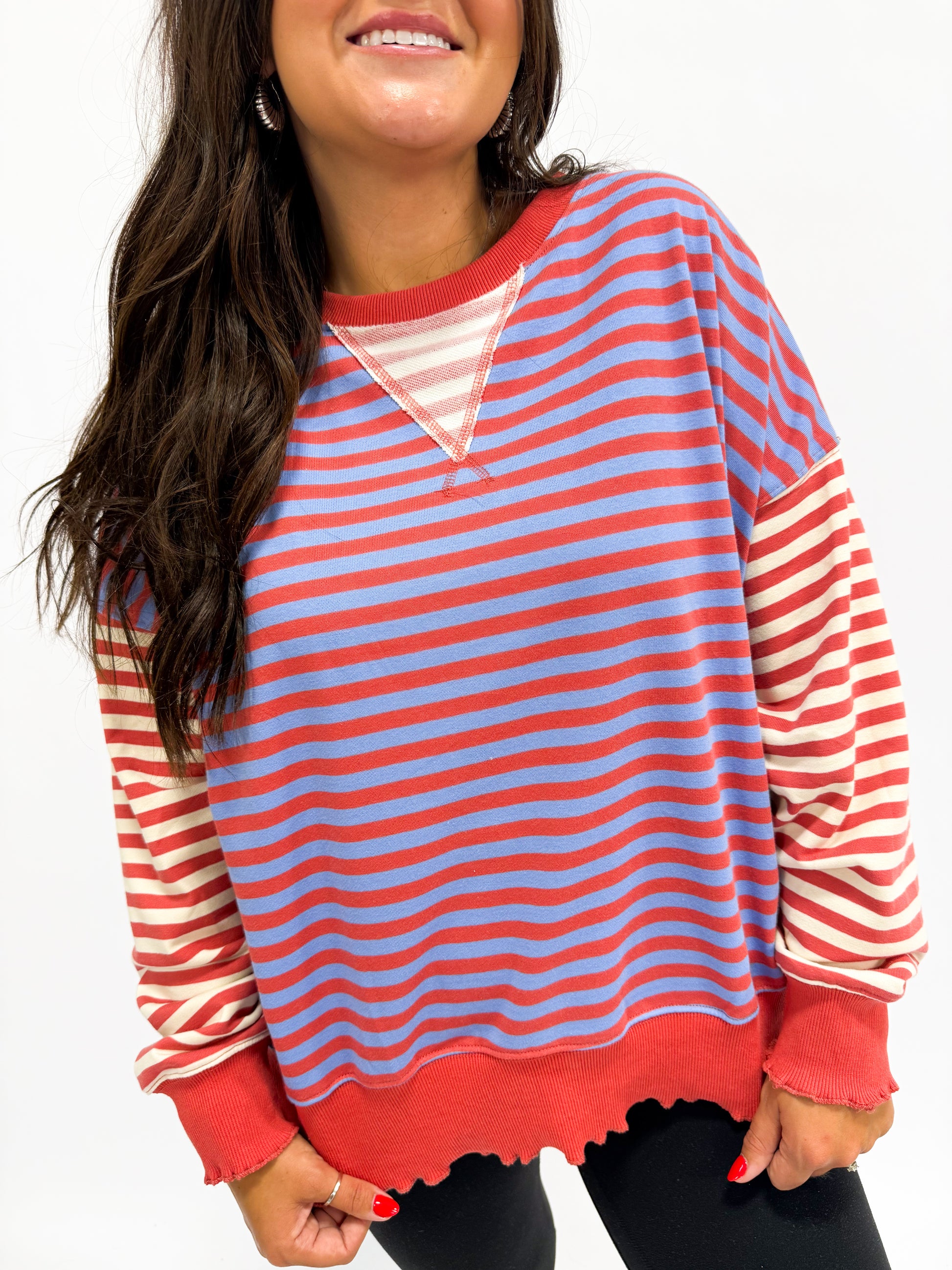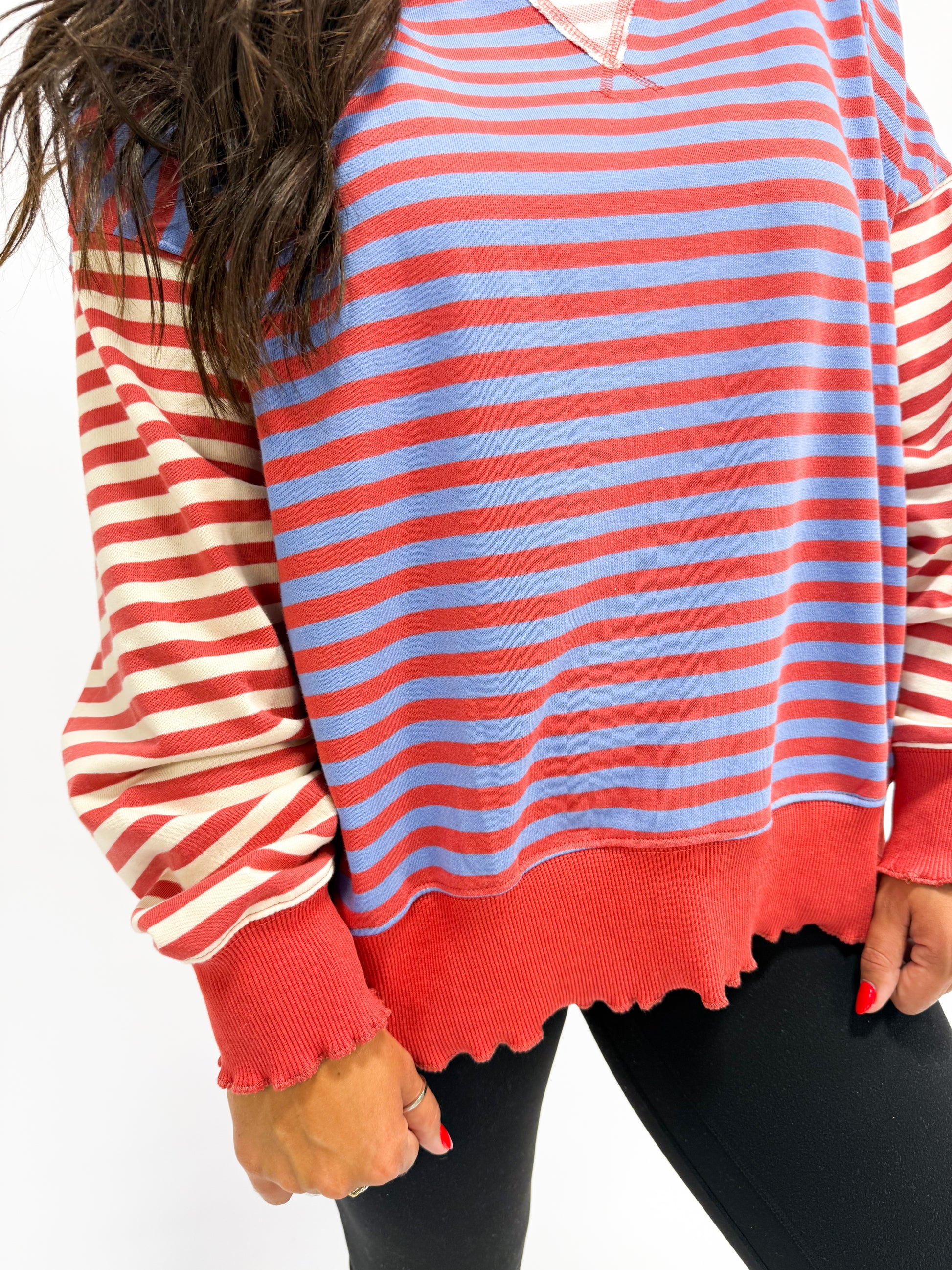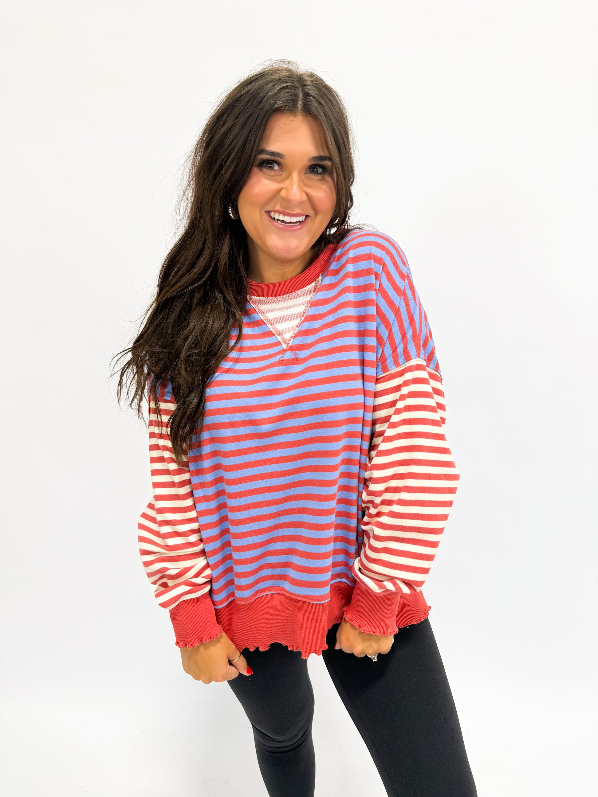 - This playful sweatshirt features bold color block stripes, a cozy crew neck, and a fun lettuce hem detail that adds a flirty twist!
