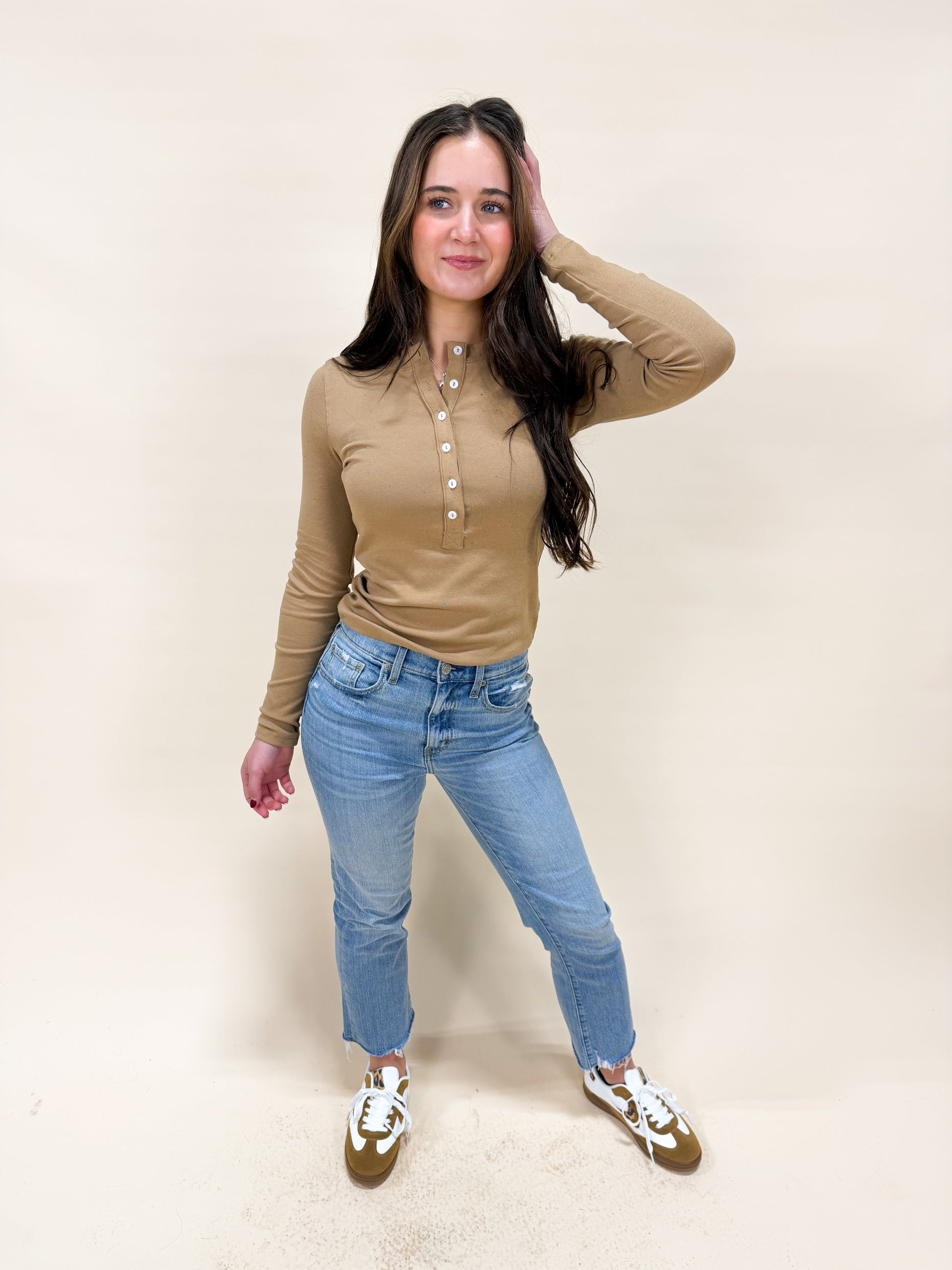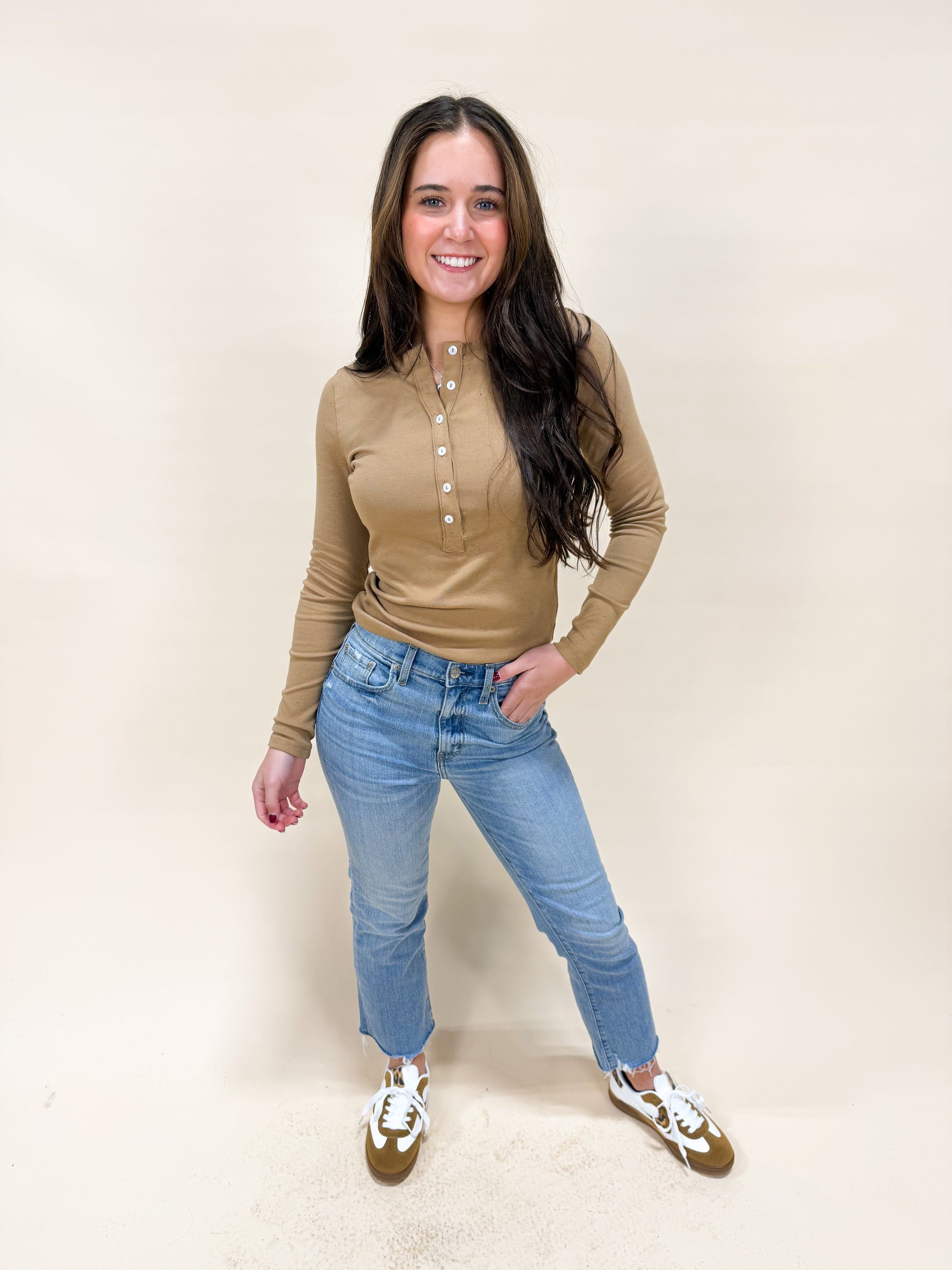 - This long sleeve knit top features a charming half button-up front that lets you customize your look!