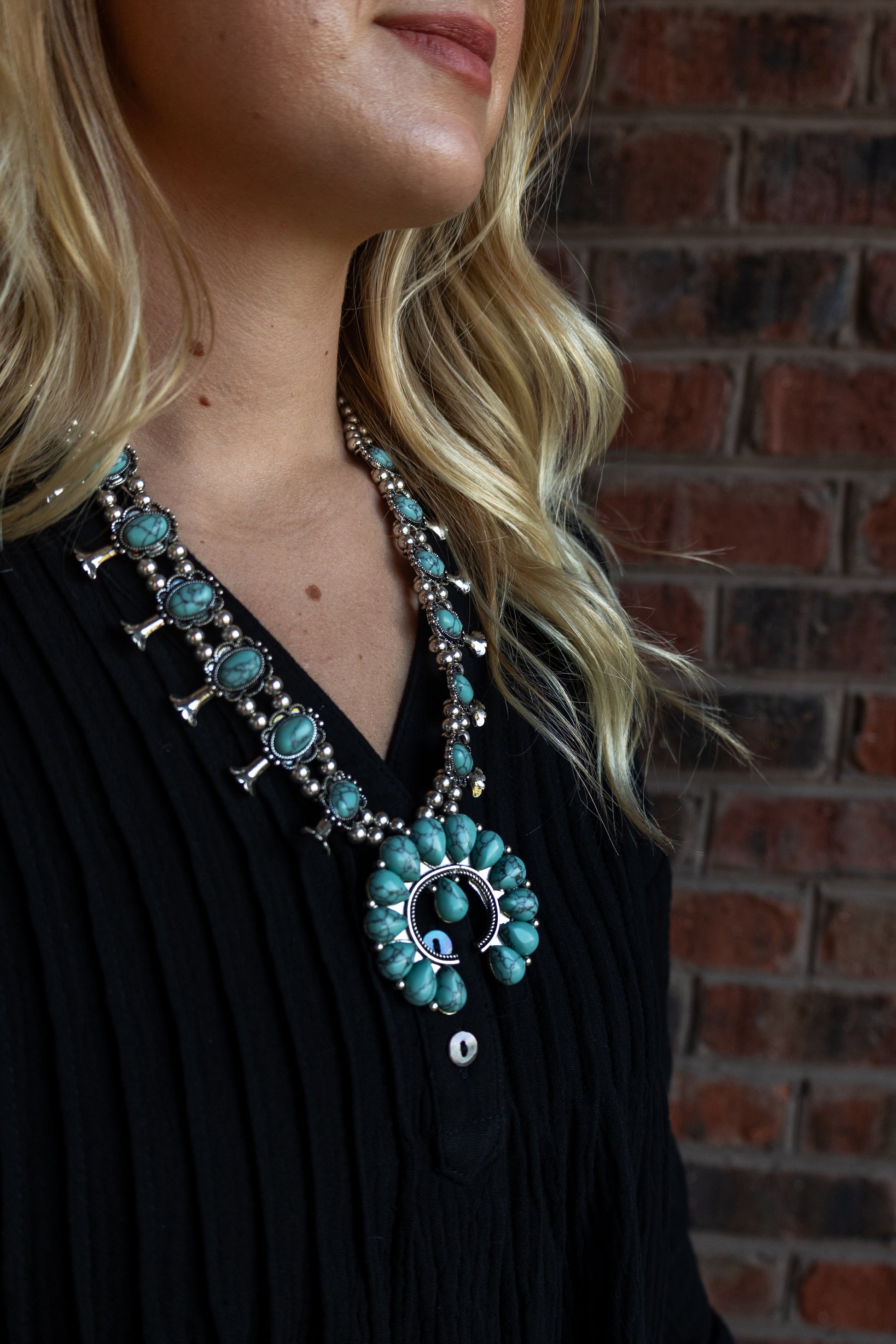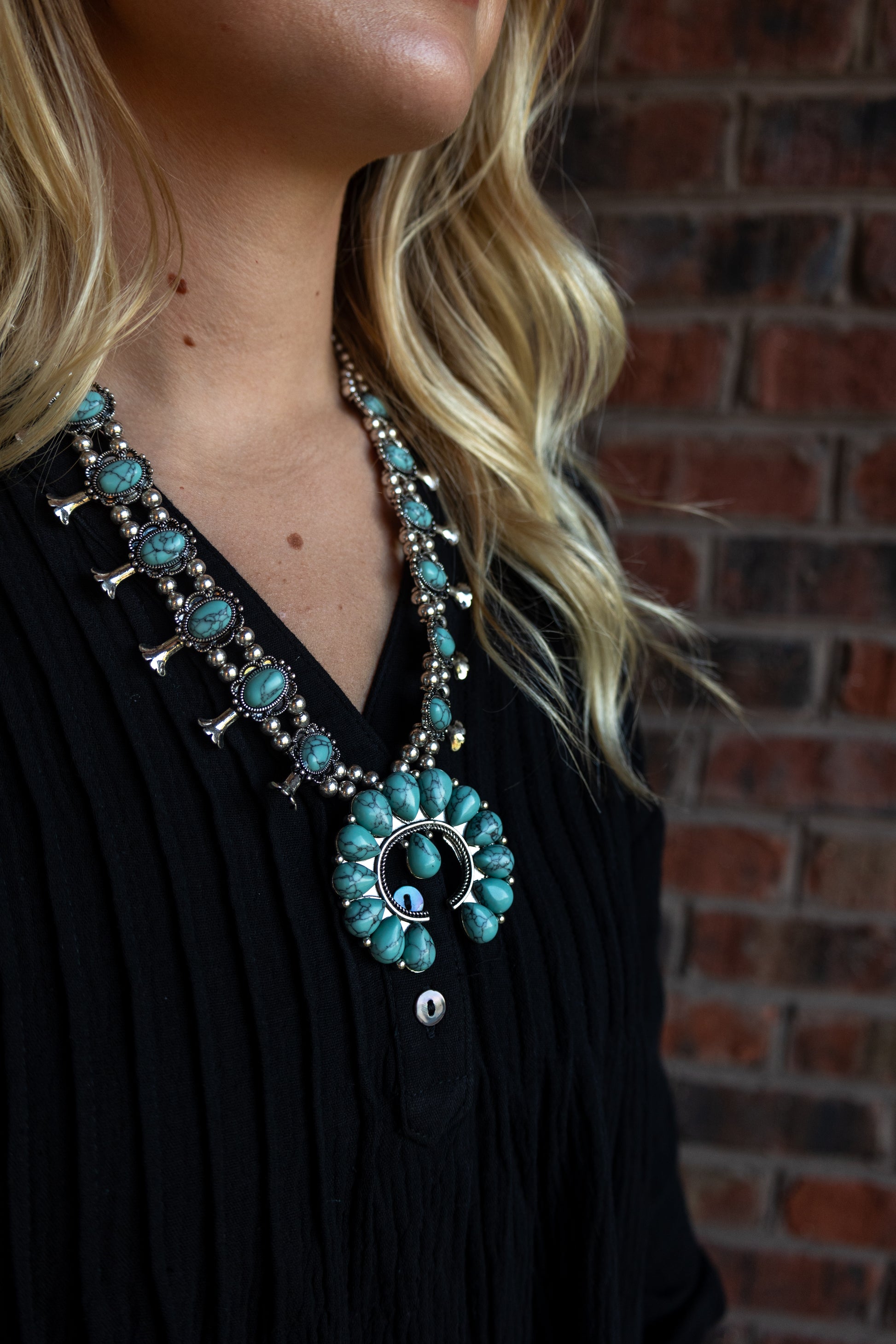 This Squash Blossom Turquoise Necklace is the ultimate faux statement piece!